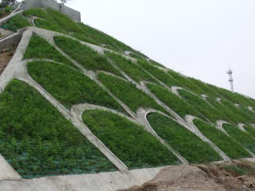 邊坡的植被覆蓋率達到30%以上時,能承受小雨的沖刷,覆蓋率達80%以上時能承受暴雨的沖刷。待植物生長茂盛時,能抵抗沖刷的徑流流速達6m/s,為一般草皮的2倍多。土工網的存在,對減少邊坡土壤的水分蒸發,增加入滲量有良好的作用。同時,由于土工網材料為黑色的聚乙烯,具有吸熱保溫的作用,可促進種子發芽,有利于植物生長。四是快速防護措施⑴當工期與植被培植期發生矛盾,在工程剛竣工即進入暴雨季節時,需采取“加筋草皮”對工程進行快速防護,以便竣工后即可得到全面覆蓋的防沖刷植被。“加筋草皮”采用三維植被網在草坪種植場或工地附近的空地上預先培植好草皮,成坪后即可整卷或分塊卷起,然后鋪設至需防護的邊坡上。⑵在難以治理的干旱地區,可使用土壤凝結劑,把選擇好的適合的草籽,經過特殊處理后,與土壤凝結劑拌和噴灑(也可以先播草籽,而后再施用土壤凝結劑)。經土壤凝結劑處理后的坡面,草籽和土壤不會因風吹雨淋而流失,同時凝結劑又降低了土壤中水分的蒸發,在一定程度上保證了草籽的水分供應,大大提高草籽的成活率。