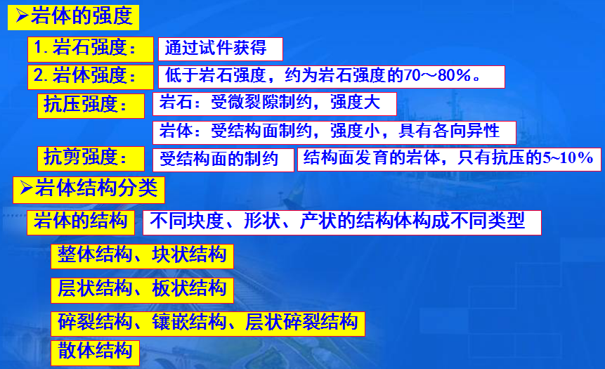 巖石與巖體的區(qū)別:巖石具有勻質(zhì)、連續(xù)、各向同性的性質(zhì),巖體具有明顯的非勻質(zhì)、不連續(xù)、各項異性。