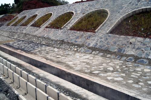 (2)路基填土高度H>3m,時(shí),采用漿砌片石襯砌拱防護(hù),當(dāng)3&1e;H&1e;4m時(shí),設(shè)置單層襯砌拱,當(dāng)4<H&1e;6m時(shí),設(shè)置雙層襯砌拱,拱內(nèi)鋪設(shè)草坪網(wǎng)布被為保證路面水或坡面水不沖刷護(hù)坡道,相應(yīng)于襯砌拱拱柱部分的護(hù)坡道也做鋪砌,并設(shè)置20號(hào)混凝土預(yù)制塊至邊溝內(nèi)側(cè)。20號(hào)混凝土預(yù)制塊的規(guī)格分為兩種,拱柱及護(hù)腳采用5cm×30cm×50cm的長(zhǎng)方體預(yù)制塊,拱圈部分采用5cm×30cm×65cm的弧形預(yù)制塊(圓心角30度,內(nèi)徑125cm,外徑130cm),預(yù)制塊間用7.5號(hào)砌漿灌注。