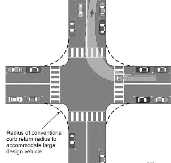 車輛轉彎都會形成內輪差和外輪差,對其他用路人形成威脅。因此,在小半徑轉彎中,應對該交叉口的所有用路人進行流線分析,并據此形成必要的隔離和控制,確保安全。在美國的規范里,交叉口的轉彎半徑,即便直角也是可行的,但要有一大堆方法解決不同用路人的轉彎。如果僅僅縮小轉彎半徑,而沒有針對用路人做必要轉彎流線優化,并有必要的控制措施,會極大的增加風險,并降低交叉口的容量。因此,形成小半徑彎道,不在于彎道半徑是多少,而在于如何確保安全和容量。圖片來源:徐耀賜/交叉口設計