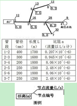 分析:如上圖所示,高程最高的用水點是節點6(標高為9.2m),距離水廠最遠的用水點是節點7(距離水廠950m),流量最大的用水點是節點7(流量為30L/S)。初步判斷節點6或者節點7有可能為控制點,下面進行具體計算。