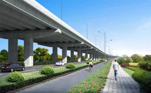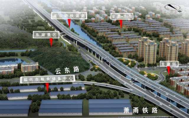 該快速路主線與鏡水路立交銜接,采用高架形式自西向東先后跨越大越路、綠云路、解放路、中興大道、越東路,二期工程延伸至越興路。 另外, 保留現(xiàn)狀鏡水路立交、大越路輔道立交,并新增綠云路和越東路2處全互通立交,沿線設(shè)置6對上下坡匝道與地面道路銜接。