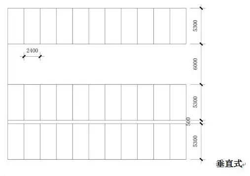 根據(jù)地形條件以占地面積小、疏散方便、保證安全為原則,主要停車方式有平行式、斜列式、垂直式三種。其中間最小距離以小型車為例,停車方式見(jiàn)下圖