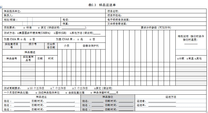 每份樣品從采樣到送至實(shí)驗(yàn)室都應(yīng)該有一個(gè)完整的樣品追蹤監(jiān)管程序,主要包括:樣品的收集、運(yùn)輸、處理和相關(guān)人員的信息;樣品采集日期、時(shí)間、深度等記錄數(shù)據(jù);樣品分析項(xiàng)目等其他信息。樣品流轉(zhuǎn)清單樣式可參考表C.3。