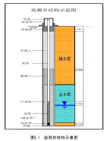 井管應(yīng)由井壁管、過濾管和沉淀管等三部分組成。井壁管位于過濾管上,過濾管下為沉淀管。過濾管位于監(jiān)測的含水層中,長度范圍為從含水層底板或沉淀管頂?shù)降叵滤灰陨系牟糠郑灰陨系牟糠忠诘叵滤粍?dòng)態(tài)變化范圍內(nèi);沉淀管的長度一般為50cm~60cm,視隔水層的厚度而定,沉淀管底部須放置在隔水層內(nèi)。地下水監(jiān)測井示意圖見圖E.1。