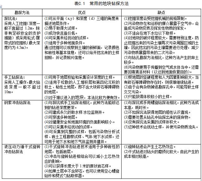 用于地塊環(huán)境評價(jià)的鉆探技術(shù)需結(jié)合地塊所在地區(qū)的地層條件、地塊鉆探的作業(yè)條件和地塊勘察的方案要求來選擇經(jīng)濟(jì)有效的鉆探方法。表C.1列出北京市地塊環(huán)境評價(jià)中的常用的鉆探方法及其優(yōu)缺點(diǎn)。