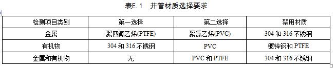 井管材質(zhì)因檢測項(xiàng)目的不同而有所差異,各類檢測項(xiàng)目的材質(zhì)選擇見表E.1。