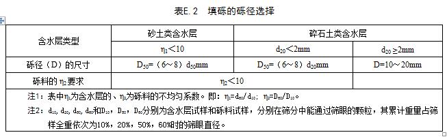 礫料的礫徑,應(yīng)根據(jù)含水層顆粒篩分?jǐn)?shù)據(jù)確定,可參照表E.2選用。