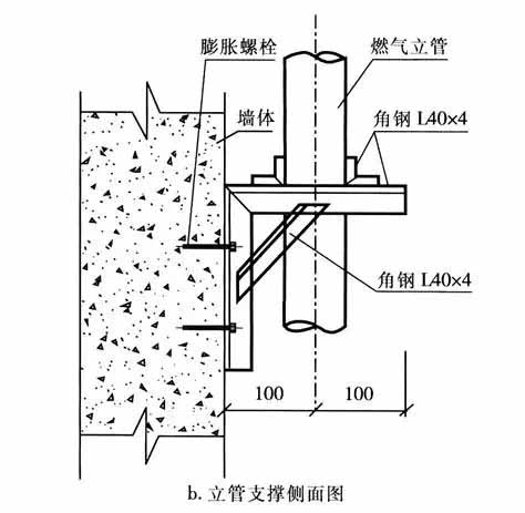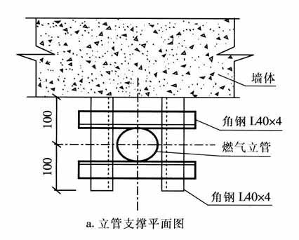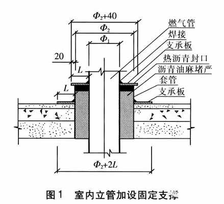 ① 對于室內(nèi)立管,在每隔7~10層的穿樓板處加設(shè)固定支撐,使燃?xì)夤艿馈⑻坠芤约敖ㄖ锍蔀橐惑w。具體做法見圖1(圖中單位為mm)。