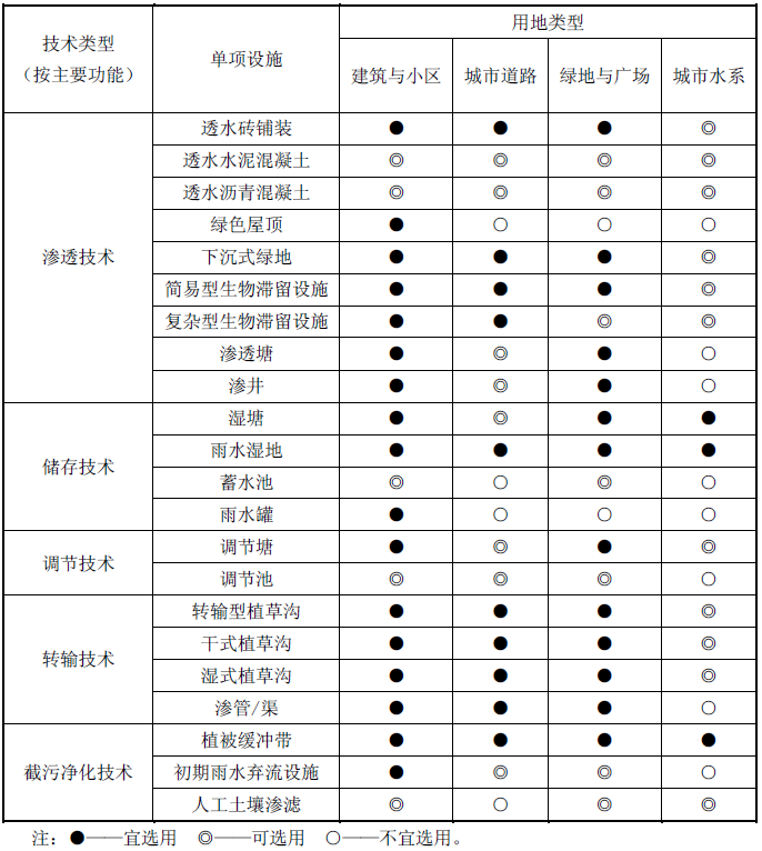 表1  各類用地中低影響開發設施選用一覽表