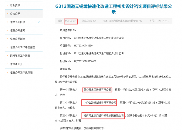 此外,無錫市城市重點項目管理中心于今年8月23日發布的《G312國道無錫境快速化改造工程初步設計咨詢項目評標結果公示》顯示,該項目標段的第一中標候選人為蘇交科、第二中標候選人為中交公路規劃設計院有限公司、第三中標候選人為招商局重慶科研設計研究院有限公司。