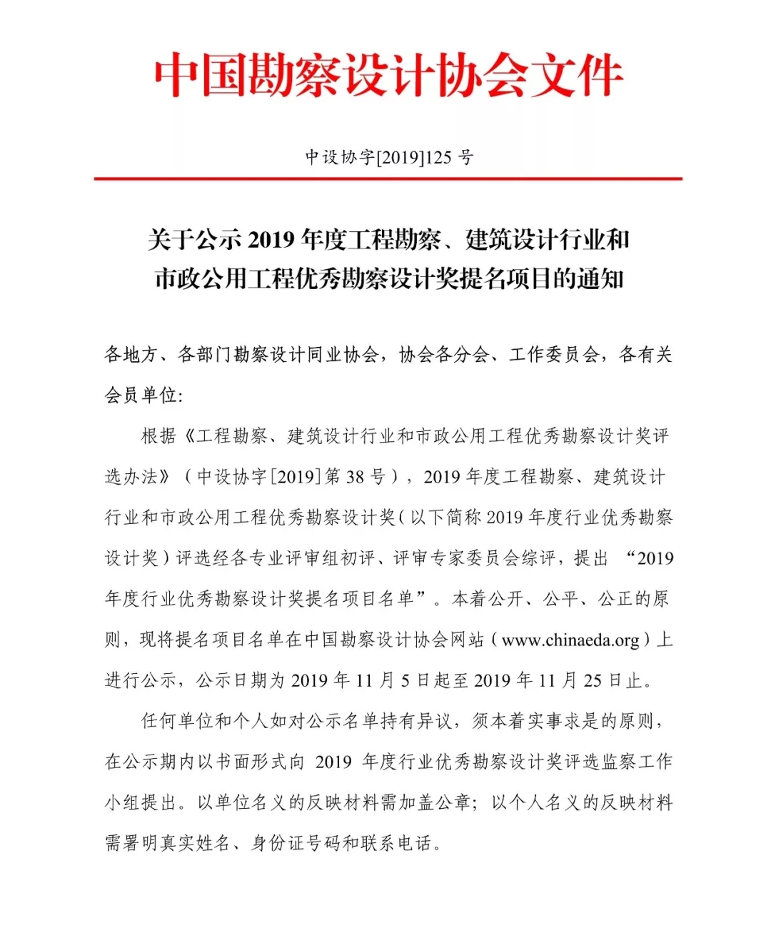 2019年度行業(yè)優(yōu)秀勘察設(shè)計(jì)獎(jiǎng)提名項(xiàng)目公布!