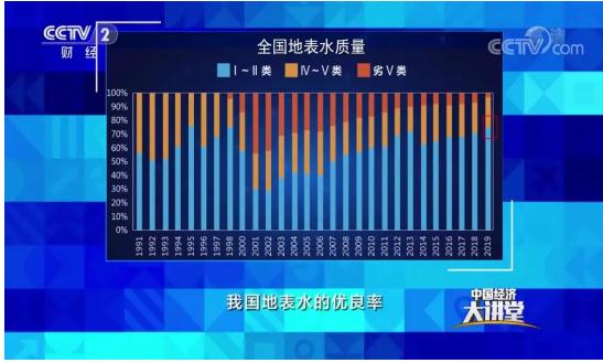 我們先來(lái)看看全國(guó)的地表水的環(huán)境質(zhì)量。2019年我國(guó)地表水的優(yōu)良率已經(jīng)達(dá)到了74.9%,這個(gè)數(shù)字比上一年提高了3.9%。