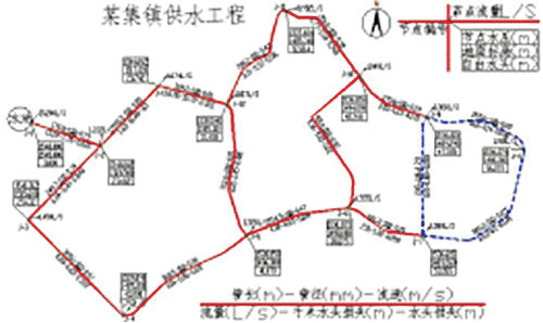 在計算該集鎮(zhèn)設(shè)計用水量之后,按照鴻業(yè)軟件平差下拉菜單中的項,做好管網(wǎng)定線、管材選擇、定節(jié)點地面標(biāo)高、定節(jié)點流量、預(yù)賦管徑之后,從圖面提取管道信息軟件自動進(jìn)行管網(wǎng)平差計算,根據(jù)計算結(jié)果調(diào)節(jié)預(yù)賦的各管段的管徑,使各個管段的流速盡量在經(jīng)濟流速范圍內(nèi)的管徑,即為最適管徑,平差結(jié)束。本工程給水管網(wǎng)平差結(jié)果及供水管網(wǎng)平差圖(圖4)如下。