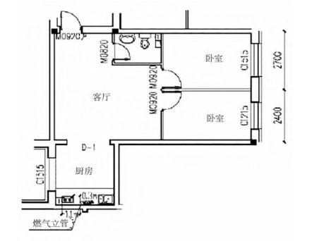 在室內(nèi)鋪設(shè)燃?xì)夤芫€時,必須注意:①不能鋪設(shè)在潮濕或含有腐蝕性介質(zhì)的房間,也不能將其引入臥室,特別是在臥室、浴室或衛(wèi)生間里;②嚴(yán)禁通過易燃、爆炸物品、配電間、變電所、煙、風(fēng)道等場所;③橫穿臥房、衛(wèi)生間或地下室的管道,應(yīng)在套管內(nèi)安裝焊接;④如需放置于潮濕或有腐蝕性介質(zhì)的室內(nèi),則應(yīng)采用防腐蝕措施;⑤管道穿越樓板、樓梯平臺、墻壁、隔墻時,應(yīng)將管線置于套管內(nèi)。⑥安裝燃?xì)庠畹姆块g凈高不宜低于2.2米,安裝熱水器的房間應(yīng)該宜大于2.4米。如圖3所示,室內(nèi)廚房豎管的設(shè)計。