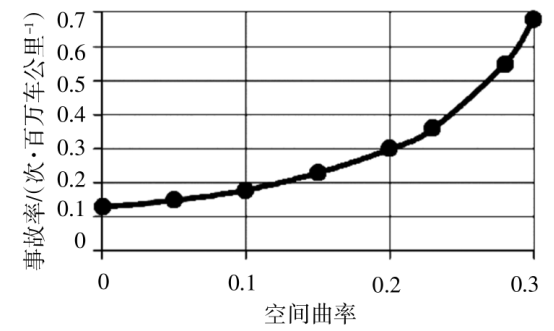 在開展公路路線設(shè)計安全性評價中,為了提高設(shè)計的合理性,還要構(gòu)建完善的系統(tǒng)分析和評價模型,主要包括行車安全事故發(fā)生概率與空間曲率指標(biāo)模型的評價。及時通告公路實際情況,結(jié)合現(xiàn)代公路安全角度進行評價,明確公路線路設(shè)計項目的完整性搜集,同時構(gòu)建完善的模型曲線關(guān)系,相關(guān)專業(yè)人士的空間曲率和安全事故發(fā)生率直接的曲線關(guān)系如圖1所示。