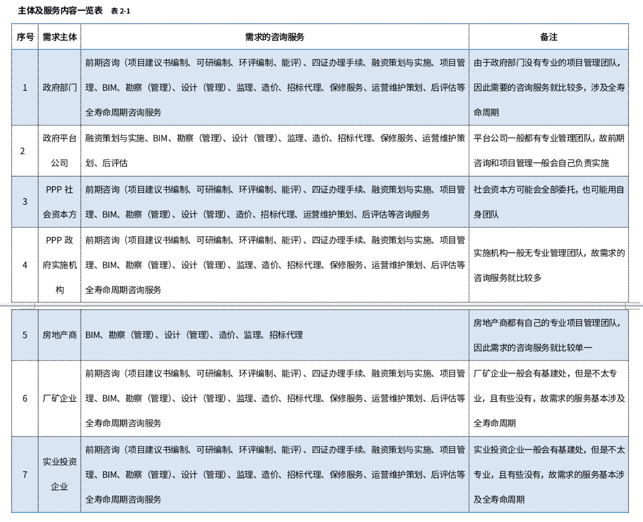 二、全過程工程咨詢服務(wù)內(nèi)容及需求主體