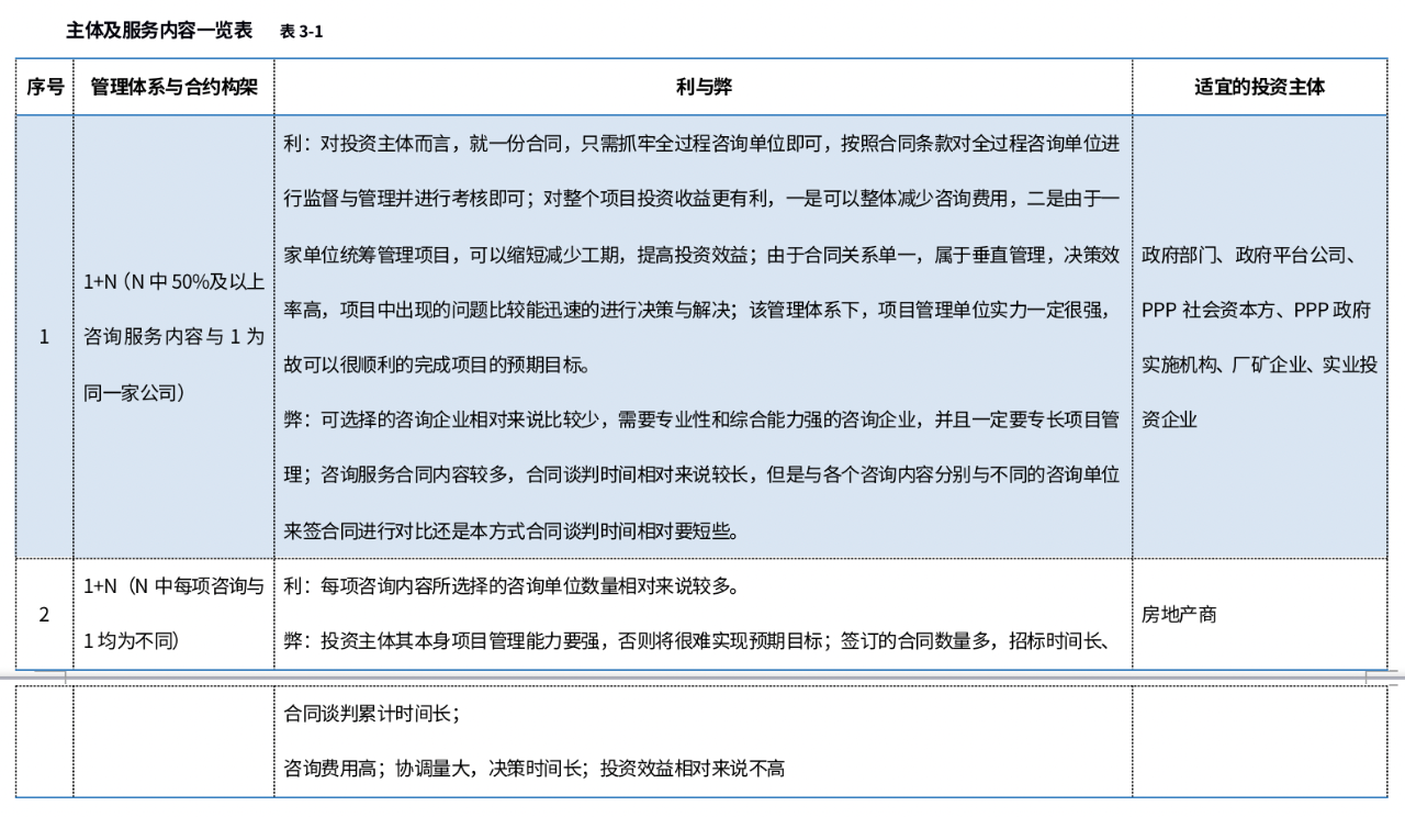 不同的投資主體所需的服務(wù)內(nèi)容和管理模式不一樣,就會導(dǎo)致項(xiàng)目管理體系上和合約構(gòu)架上不一樣,以下通過表格闡述不同的管理體系和合約構(gòu)架的利與弊及適宜的投資主體(本文倡導(dǎo)的全過程咨詢以項(xiàng)目管理為主線,用1表示,前期咨詢、監(jiān)理、造價、招標(biāo)代理、勘察設(shè)計管理等用N表示):