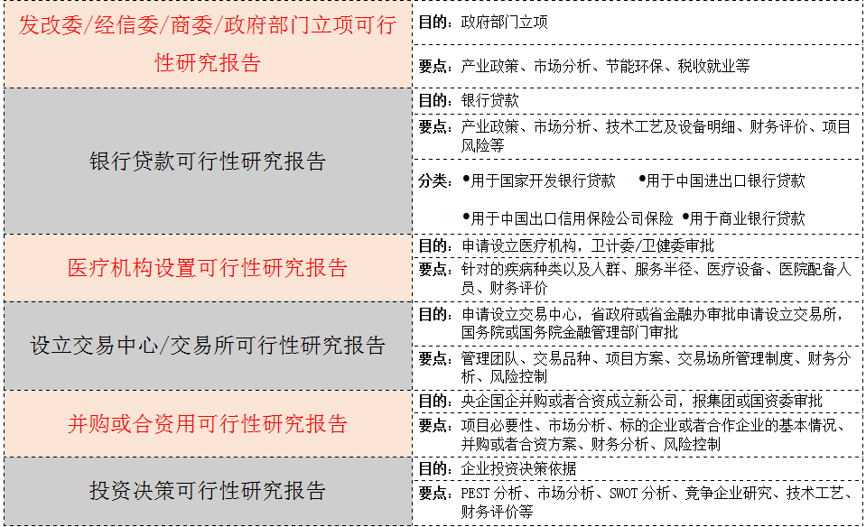 各類可行性研究報告內容側重點差異較大,但一般應包括以下內容: