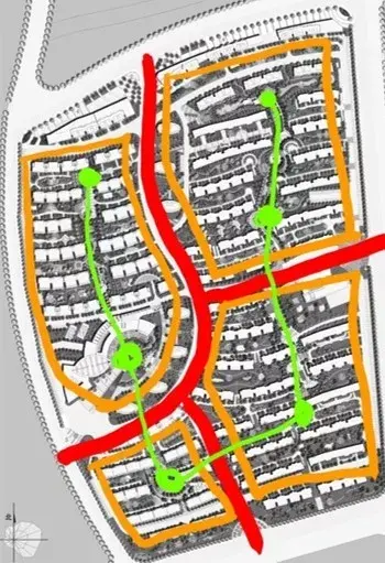 強(qiáng)調(diào)南北主線, 通過錯開的方式獲得變化,內(nèi)部加入環(huán)形路聯(lián)系四個組團(tuán)中心,適合低密度產(chǎn)品。