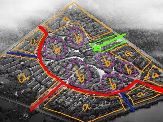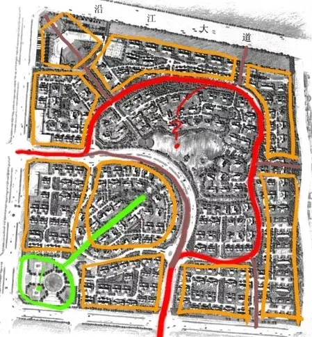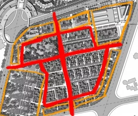用地中間做環(huán)形道路,向外引出錯落的分支道路,形成各自獨(dú)立的組團(tuán),中心適宜做景觀。
