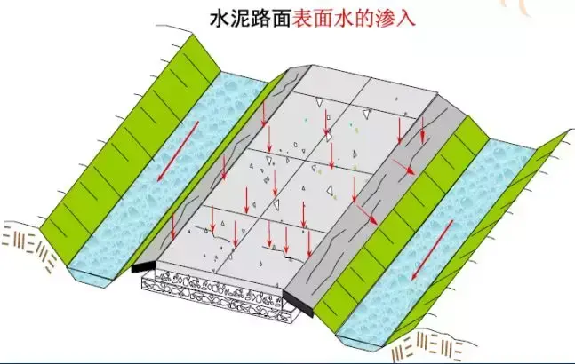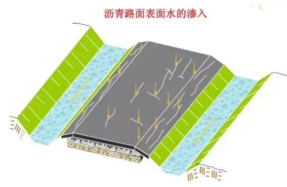 路面結(jié)構(gòu)內(nèi)部水的危害:浸濕各結(jié)構(gòu)層材料和路基土,易造成無(wú)粘結(jié)粒狀材料和地基土的強(qiáng)度降低;使水泥混凝土路面產(chǎn)生唧泥,隨之出現(xiàn)錯(cuò)臺(tái)、開(kāi)裂和整個(gè)路肩破壞;進(jìn)入空隙的自由水在行車(chē)荷載的作用下,會(huì)形成高孔隙水壓力和高流速的水流,引起路面基層的細(xì)顆粒產(chǎn)生唧泥,結(jié)果失去支承;在冰凍深度大于路面厚度的地方,高地下水位會(huì)造成凍脹,并在凍融期間降低承載能力;水使凍脹土產(chǎn)生不均勻凍脹;與水經(jīng)常接觸將使瀝青混合料剝落,影響瀝青混凝土耐久性和產(chǎn)生龜裂。