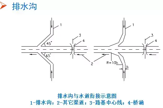 (3)排水溝水流注入其他溝渠或水道時(shí),應(yīng)使原水道不產(chǎn)生沖刷或淤積。通常應(yīng)使排水溝與原水道兩者成銳角相交,交角不大于45?,有條件可用半徑R=10b(b為溝頂寬)的圓曲線(xiàn)朝下游與其它水道相接。
