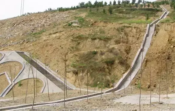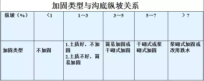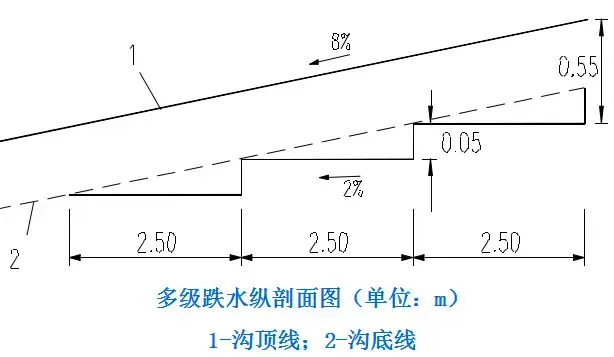 5.急流槽:在陡坡或深溝地段設(shè)置的坡度較陡、水流不離開(kāi)槽底的溝槽稱(chēng)作急流槽。急流槽的作用是在較短的距離內(nèi)以溝渠的方式引排水流、降低水頭,進(jìn)而防止沖刷(可用于比跌水更陡的坡度,可達(dá)600)。