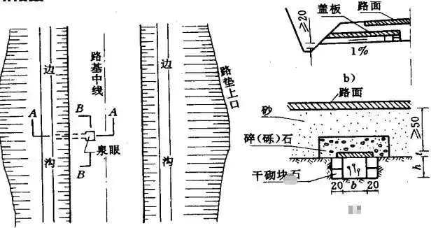 1.邊溝:邊溝用于匯集和排除降落在路基范圍內(nèi)以及流向路基的少量地表水。邊溝設(shè)置在挖方路基的路肩外側(cè)或低路堤的坡腳外側(cè),多與路中線(xiàn)平行,用以匯集和排除路基范圍內(nèi)流向路基的少量地面水。
