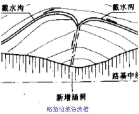 急流槽設(shè)置通常設(shè)置在高路堤邊坡、高路塹邊坡、路塹與高路堤連接處、回頭曲線(xiàn)上下邊溝等位置,是山區(qū)公路溝通上下線(xiàn)路路基排水及溝渠出水口的一種常見(jiàn)排水設(shè)施。