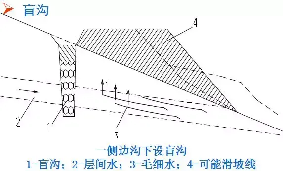 7.盲溝:相對(duì)于地面排水的明溝而言,盲溝又稱(chēng)為暗溝,是一種隱蔽工程。在溝內(nèi)填以大小不同的顆粒材料,利用滲水材料的透水性將地下水匯集與溝內(nèi),并沿溝排泄至指定地點(diǎn)。