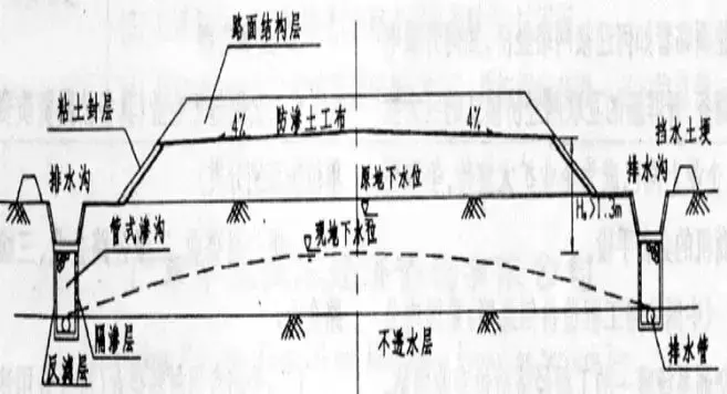 (1)路線(xiàn)高度與原地面相仿,排水困難,距地面有滲透性土層。