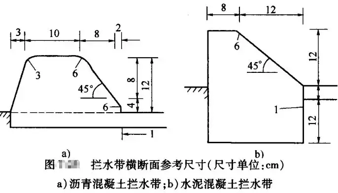 攔水帶可由瀝青混凝土現(xiàn)場(chǎng)澆筑,或者由水泥混凝土預(yù)制塊鋪砌而成。