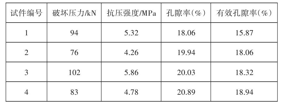同時,水灰比W/C指標需要按照集料級配設計結果具體確定,并基于工程實際情況通過室內試驗進行優化。本項目集料選用花崗巖,采用室內試驗進行分析,以水灰比W/C=0.4的標準制作4組試件,并分別開展試驗,所得結果如表2所示。